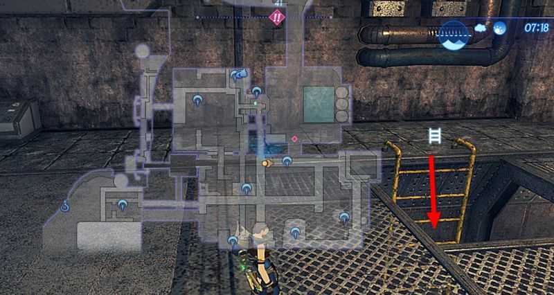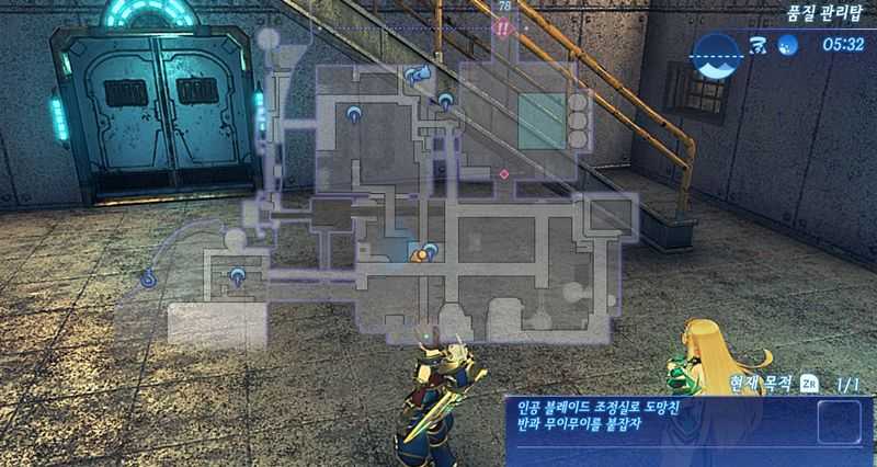 - (보물상자를 얻고 싶은 분들을 위한 선택사항) 문을 열고 들어간 통로에서 바로 좌측 첫번째 문을 열고 들어간 뒤, 바로 앞의 구멍으로 떨어집시다. 구멍아래로 떨어지면 적 Lv.30 "브리츠 앙그" Lv.28 "데그레 라푸타"와 같은 적이 있고, 뒤쪽에 보물상자가 있습니다. 코먼 코어 크리스털, 기계화 레그가드(다운 상태인 적을 공격했을 때 주는 대미지 50% 상승) 획득가능합니다. 문을 열고 계단을 올라가면 원위치로 되돌아갈 수 있습니다.