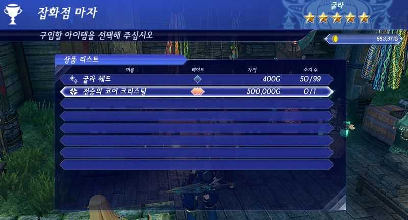 그리고 앞으로 전진하여 "트리고 상점가"에 있는 "잡화점 마자"에서 "전승의 코어 크리스털"을 구매하도록 합시다. 구매하는데는 50만G가 필요합니다.