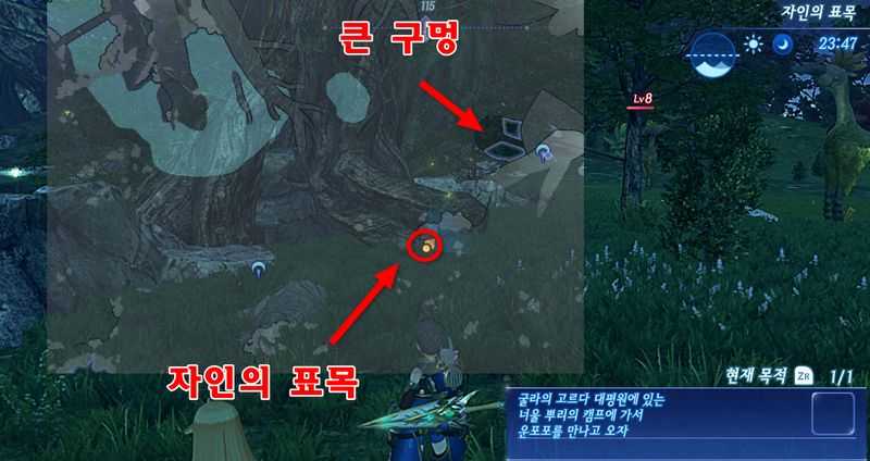 굴라 상층 우반신의 랜드마크 "자인의 표목"으로 이동해 북동쪽"에 있는 큰 구멍아래로 내려가 "너울 뿌리의 캠프"에 있는 "운포포"와 대화합니다.