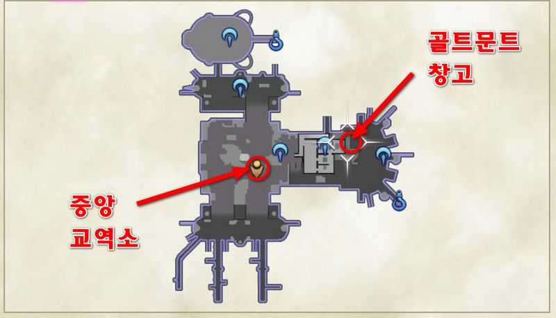 스킵트래블로 아바리티아 상회 골트문트의 랜드마크 "중앙 교역소"로 이동합니다. 그후 맵 우측 바깥으로 나가시면 "샐비지 갑판"이 나옵니다. "샐비지 갑판" 좌측편에 "골트문트 창고"가 있습니다.