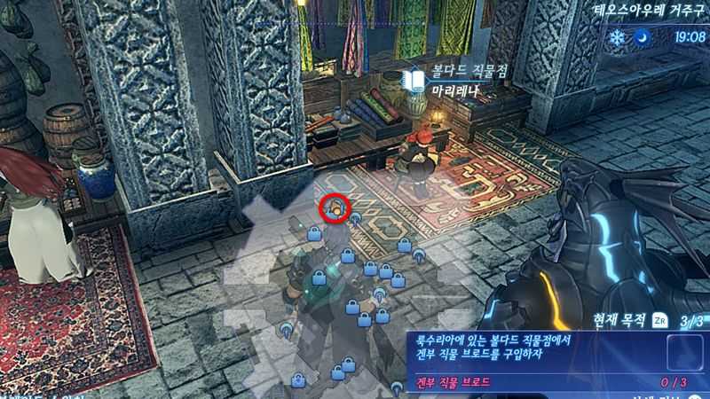 룩수리아 왕국 왕도 테오스아우레 정문으로 스킵트래블합니다. 그후 북쪽으로 이동해 "테오스아우레 거주구"에 있는 직물 상점에서 "겐부 직물 브로드"를 구입합니다. 총 3개 구입합니다.