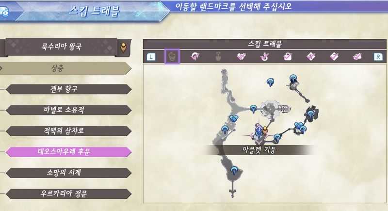 룩수리아 왕국 상층의 "테오스라우레 후문"으로 스킵트래블합니다.