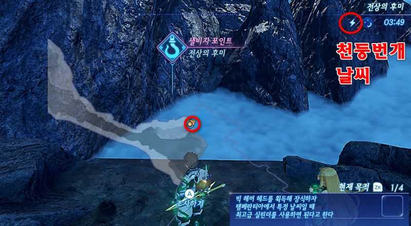 날씨가 "천둥번개" 상태가 되었다면 전상의후미 근처 언덕을 올라가 샐비지 포인트 "전상의 후미"에서 "프리미엄 실린더"를 사용해 샐비지를 합니다.