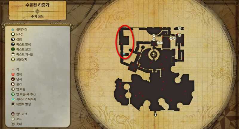 "이블 오키스"는 "수저 성도"의 "수몰된 하층가"의 맵 좌측 부근에서 쉽게 발견됩니다.