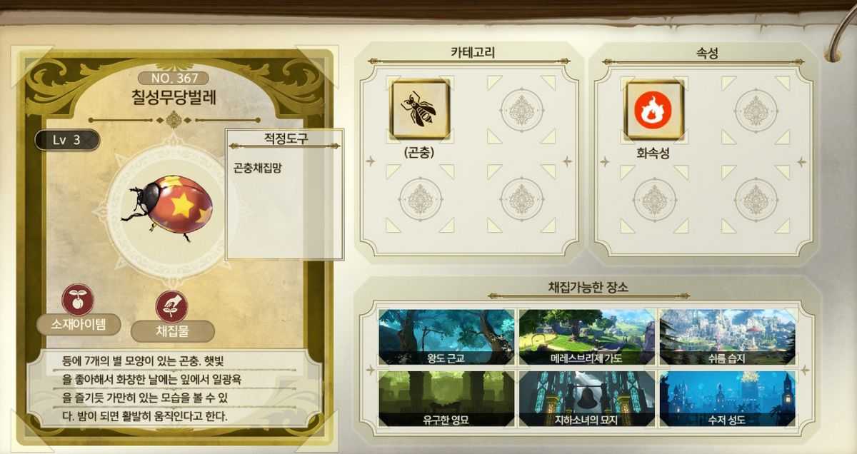 "칠성무당벌레"는 "왕도 근교"의 "별수호자의 호수"에서 쉽게 수집가능합니다. 스킬트리에서 "곤충채집망"을 제작해 채집도구에 장착해야 잡을 수 있습니다.