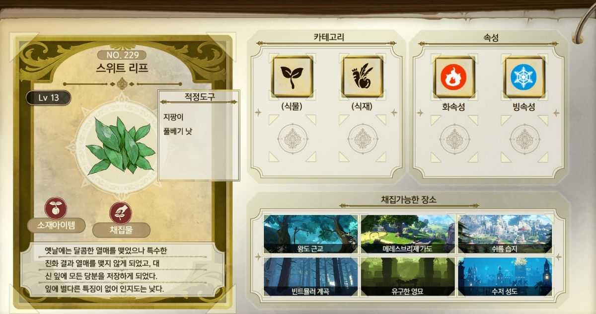 카페에서의 퀘스트로 "스위트 리프 3개 납품" 의뢰가 간간히 들어오니 위치를 파악해두거나, 여유있을때 일정량 수집해두면 유용하게 쓰일 것입니다.