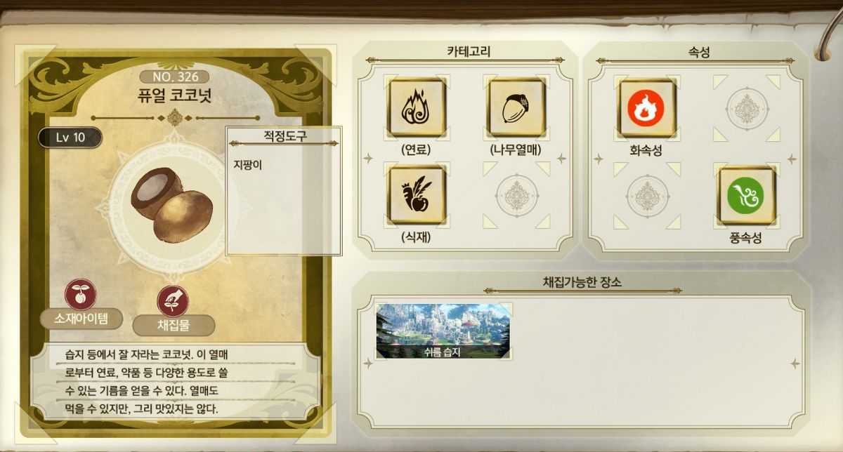 "퓨얼 코코넛"은 "바람이 부는 골짜기"의 "쉬름 습지"에서 쉽게 수집가능합니다. 바닥에 떨어진 갈색 열매를 조사하거나, 나무를 지팡이로 스윙하면 획득할 수 있습니다.