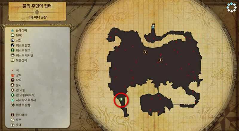 "고대 마나 공방"의 "불의 주민의 집터"로 이동후 맵의 남서쪽(침식된 폐갱도)로 이동합니다.