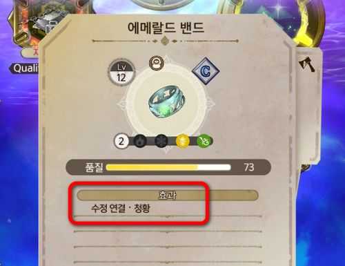 (수정 연결 · 청황) 효과가 붙은 "에메랄드 밴드"를 모험도구에 장착하고 갑시다. (조합시 효과1에 "에메랄드 풀"을 4개 투입)