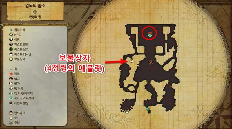 - 보스전을 하기전에 "영목의 침소"에 있는 보물상자를 열어 "4정령의 애뮬릿"을 획득한뒤 장착하면 전투에 도움이 될 것입니다. (4정령의 애뮬릿은 4가지 속성의 CC 소비량을 1 감소시켜주는 효과가 있습니다)