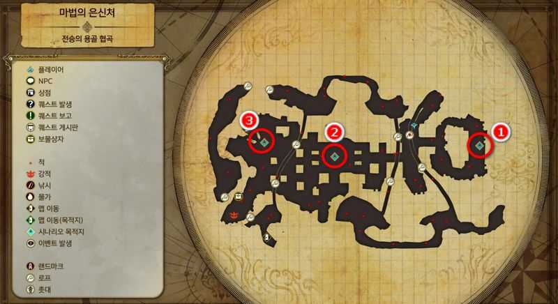 "전승의 용골 협곡"의 "마법의 은신처"의 북서쪽(맵이동 목적지)로 이동하면 이벤트가 발생하며, "푸른 달의 동굴"에 도착하게 됩니다.