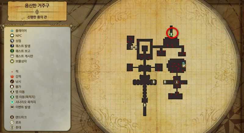 이벤트후 "잃어버린 유적"의 북쪽 끝(맵이동 목적지)로 이동하면 "신령한 용의 관"의 "음산한 거주구"에 도착하게 됩니다.