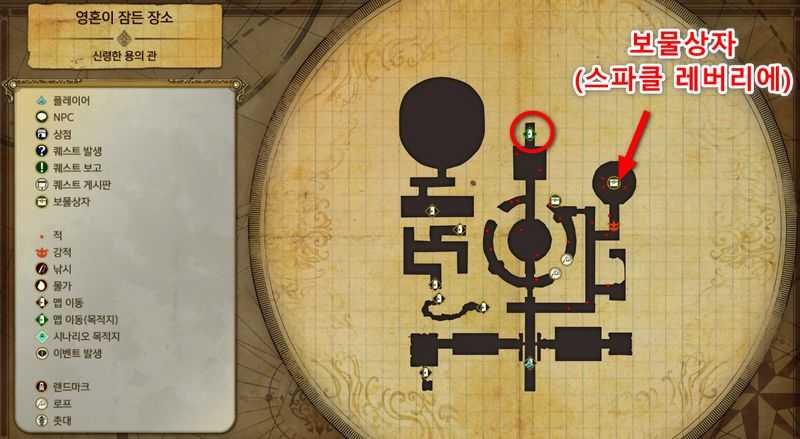 "신령한 용의 관"의 "현자의 거처"의 북쪽(맵이동 목적지)로 이동하면 이벤트가 발생하며, "영혼이 잠든 장소"에 도착하게 됩니다.