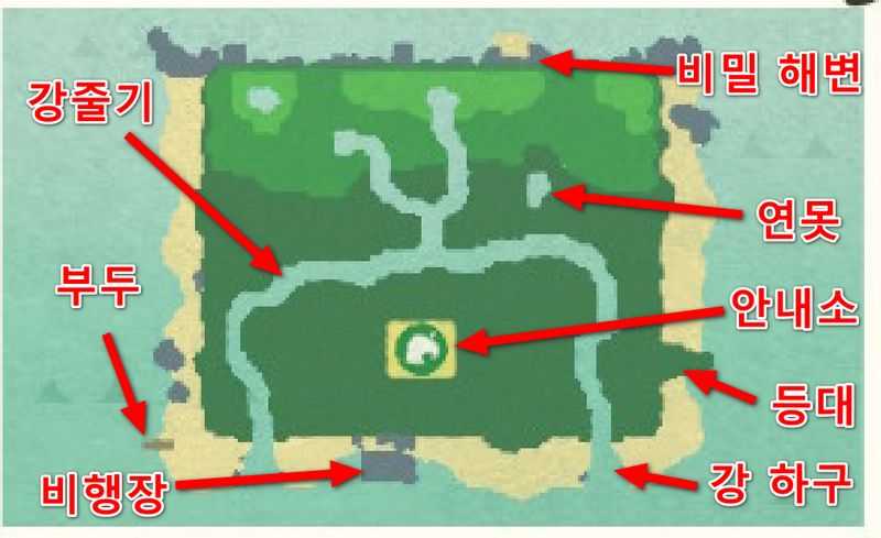 - 안내소의 위치는 일반적으로 중앙에 배치되는 편이지만, 간혹 한쪽구석에 배치되는 경우도 있습니다. 초반에 섬 생활을 하는 동안 안내소를 자주 들락날락하게 되므로, 안내소의 위치는 중심부에 위치한 지형이 좋습니다.