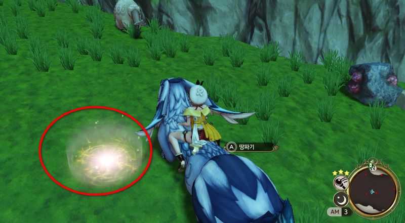 "영수의 호각"을 모험도구에 장착한 후, 좌측 스틱을 꾸욱 눌러 영수를 소환해 올라탄뒤, 맵을 돌아다니면 간혹 빛나는 땅을 발견할 수 있습니다.
