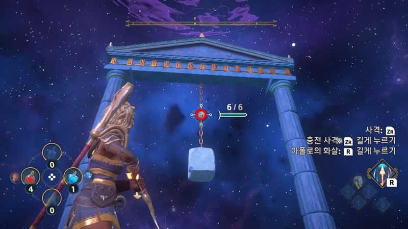 이번에는 "오디세우스의 활"을 사용해 안쪽에 있는 과녁을 1회 맞추면 발판이 나타납니다. 발판을 밟고 길을 진행합니다.