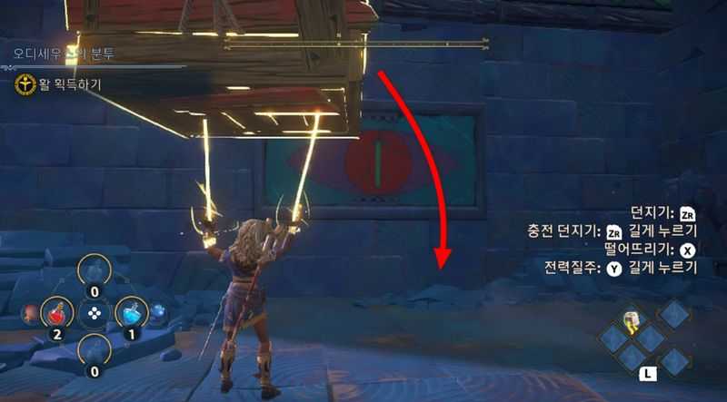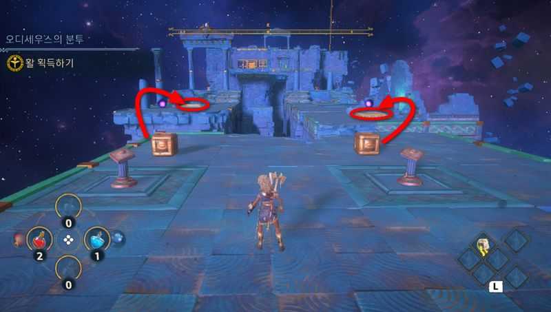 오른쪽에 동떨어져 있는 발판의 작은 상자는 헤라클레스의 힘으로 끌어당겨서 받침대 위에 올립니다. ( L을 길게 누르면서 X를 눌러서 끌어당기기)
