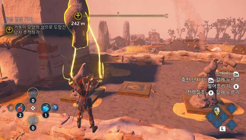 나침반의 목적지로 향해야 합니다. 현재는 정면으로 가기 힘드므로, 뒤로 돌아 망가진 다리를 건너서 가야 합니다. 다리가 끊어져 있지만 "부러진 날개"가 있으므로 이단 도약이 가능합니다. 이단 도약으로 망가진 다리를 건너 섬의 뒤쪽으로 이동합니다. (다리의 살짝 아래로 내려가 이단도약을 할 필요가 있습니다)