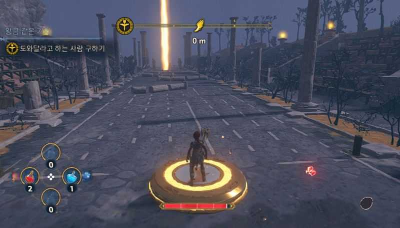 받침대를 밟은 뒤, 일정시간 내에 안쪽의 빛 기둥을 통과하면 "카론의 동전" x2 를 획득할 수 있습니다. Y버튼을 길게 누르면 전력질주가 가능합니다. 자동저장을 불러오기 하여 마음껏 재도전할 수 있으니 획득해둡시다.