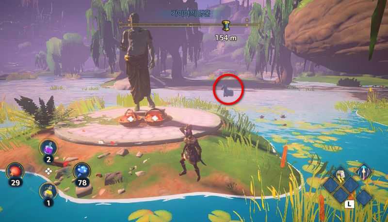 그러면 강가에 있는 석상 주변에서 뛰놀고 있는 색깔이 파란 말을 발견할 수 있을 것입니다.