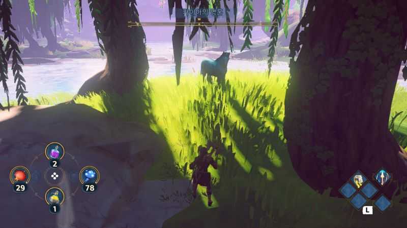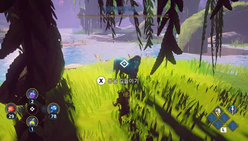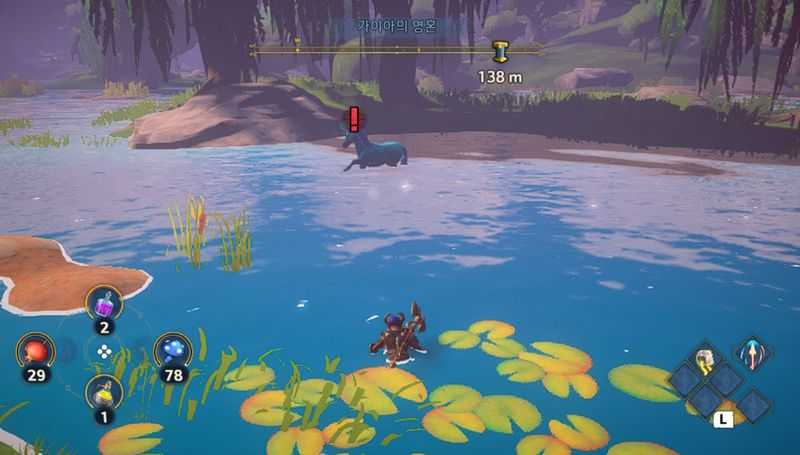 특히 물속에 있는 때는 웅크리기가 안되기 때문에, 탈것을 길들이기가 힘듭니다. 따라서 그 파란 말이 물속에 있다면, 서서 접근하여 육지 쪽으로 도망치게 만듭니다.