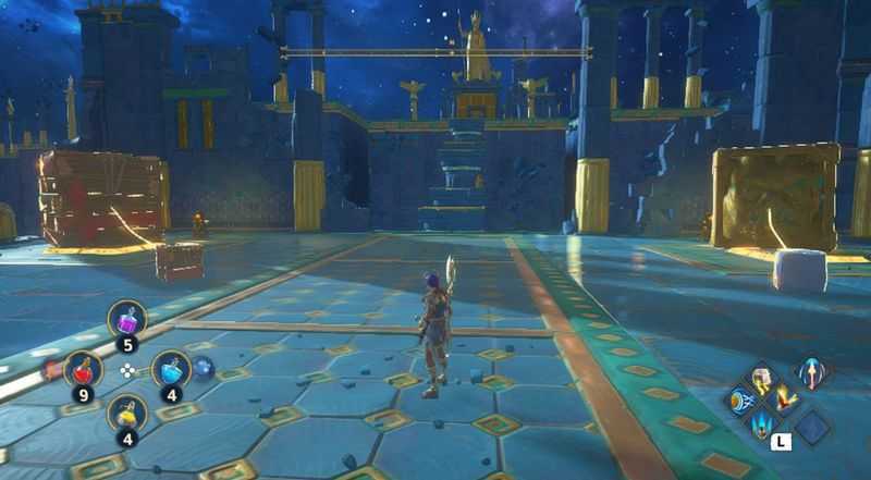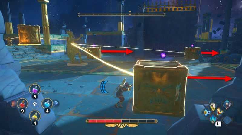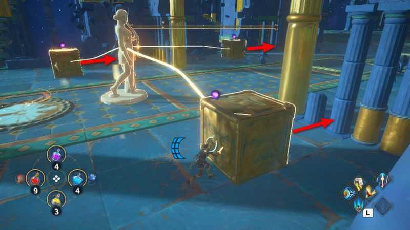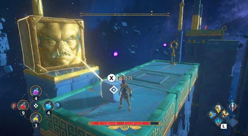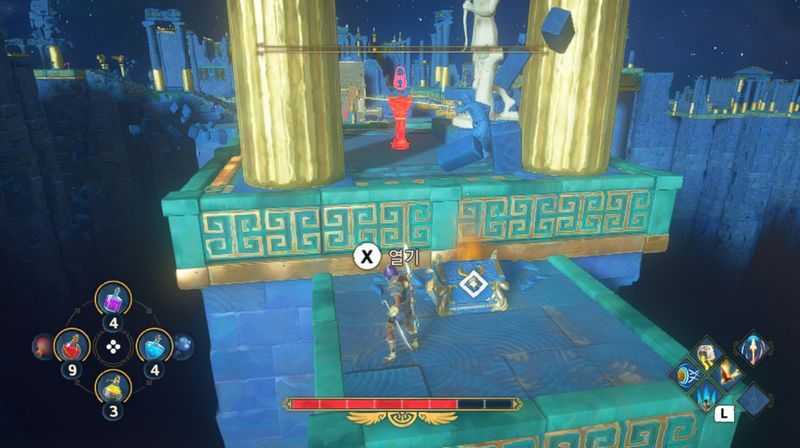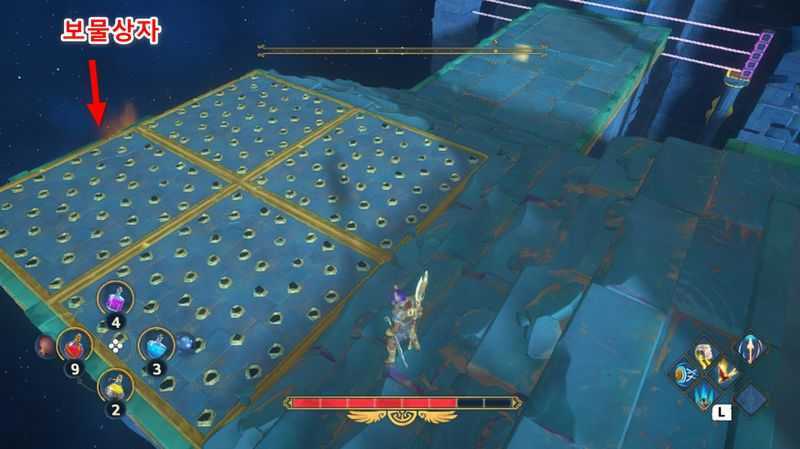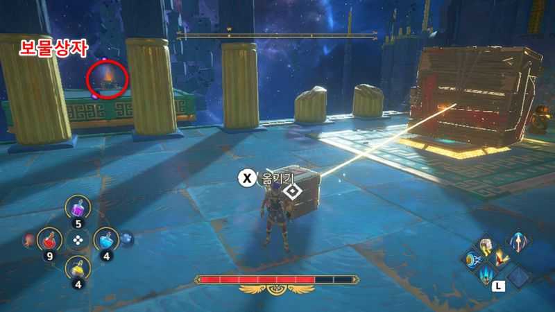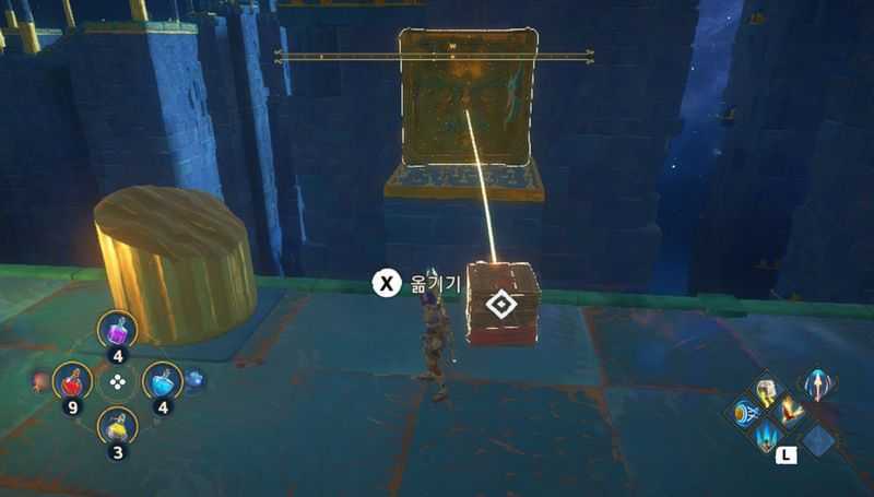 3개의 상자를 모두 3개의 받침대에 올리는데 성공했다면, 이제 칼을 든 동상에 연결된 상자를 밀어서 받침대위에 올려줍니다.