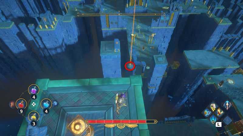 스위치의 아래쪽으로 내려다보면 노란 빛이 나오는 장소가 있을 것입니다. 거기에 보물상자가 있으니 내려가서 열어봅시다. (카론의 동전 x2 획득)