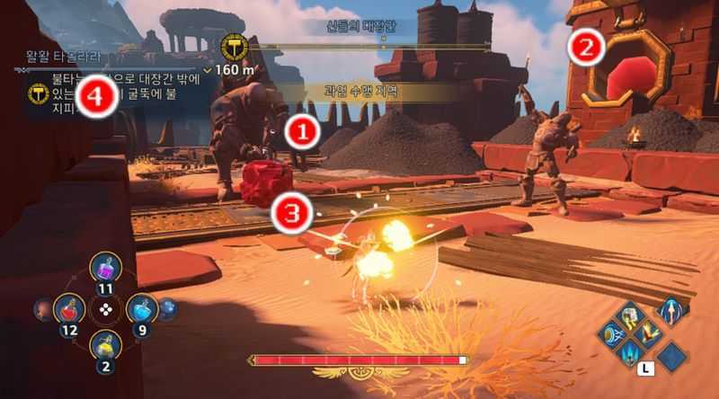 그후 번호3의 빨간 돌을 파괴한 후, 레버를 활성화합니다. 이제 아폴로의 화살로 번호4 쪽에 있는 불을 스쳐서 굴뚝안을 맞춰서 불을 지피면 3번굴뚝 완료입니다.