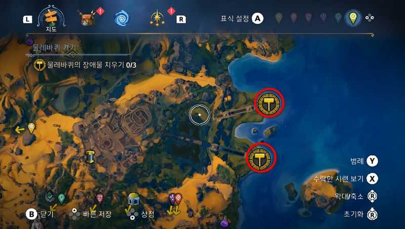 나침반의 목적지로 이동후, 적을 물리치고, 맨 아래에 있는 송수로에 붙어 있는 빨간 돌을 모두 파괴합니다.