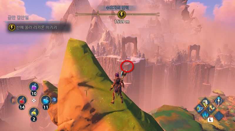 절벽끝에서 위 사진에서 빨간 동그라미로 표시된 곳으로 날아가 왕의 봉우리로 이동하시면 됩니다.