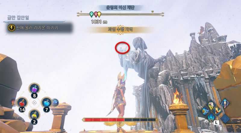 그후 길을 가다보면 위 사진과 같은 벽이 있는 위치에 도달할 것입니다. 벽을 기어올라가 상승기류를 타고 위로 올라가다보면 "운명의 여신 제단"에 도착할 것입니다.