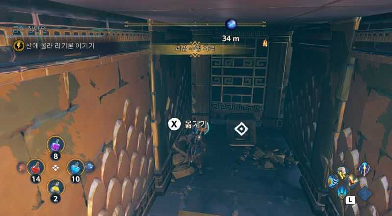 중간에 만나게 되는 적들을 물리쳐가며, 길을 계속 나아가다 보면, 위 사진과 같은 위치에 도착하게 될 것입니다. 왼쪽에는 "키르케의 솥"이 있을 것입니다. 이제 정면에 보이는 벽을 올라갑니다.