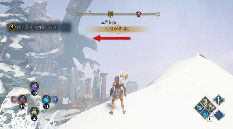 거대한 조각상의 손에서 절벽위로 올라가면 이벤트가 발생하며 적과의 전투가 펼쳐집니다.