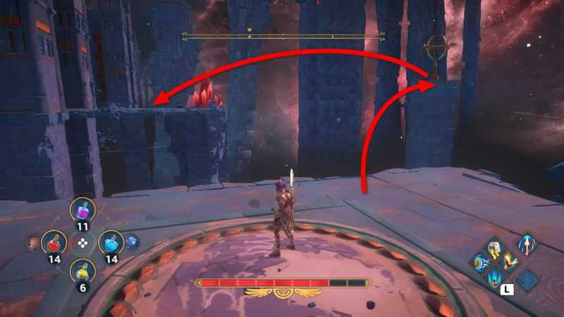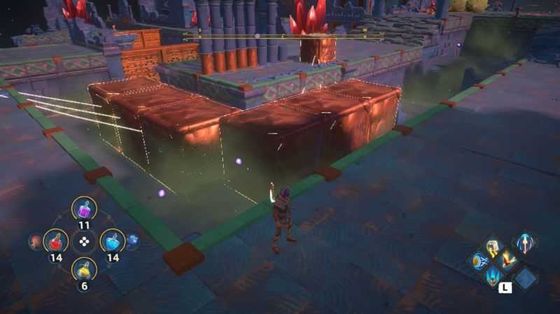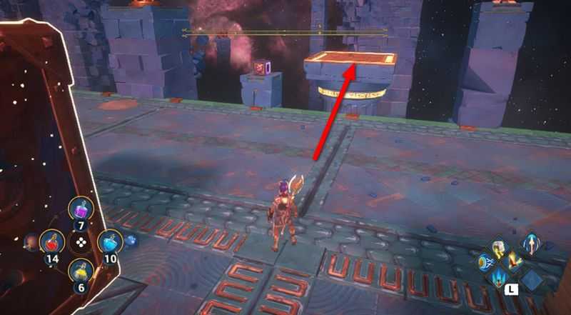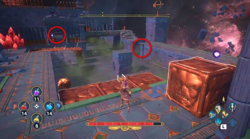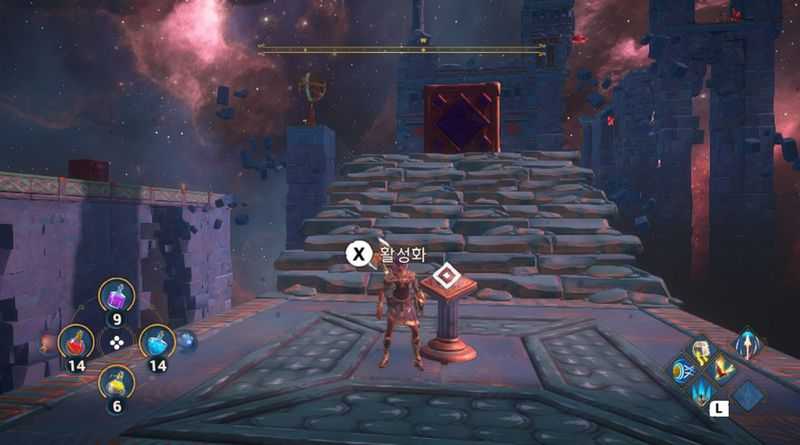 오른쪽 앞 : 장치를 활성화하면 앞에 오리칼쿰 큐브가 출현합니다. 오리칼쿰 큐브를 공격하여 공중에 띄운 후, 맞은편 받침대를 향해 던진후, 받침대위에 올려 놓습니다.