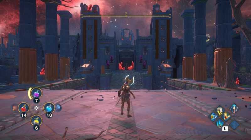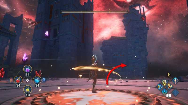 여러번 반복해서 벽이 어느정도 무너지면, 둥근 받침대 위에 올라가 아폴로의 화살로 불을 스쳐 구멍 2개를 통과하여 안쪽의 씨앗을 불태웁니다.