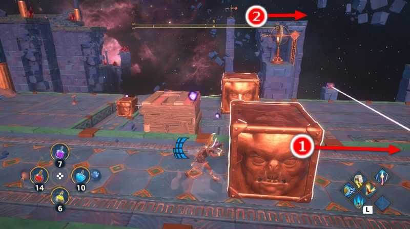 왼쪽 안쪽 : 장치를 활성화하면 연결된 상자 2개가 출현합니다. 왼쪽 상자를 밀어서 오른쪽 상자를 받침대위에 올려놓으면 됩니다.