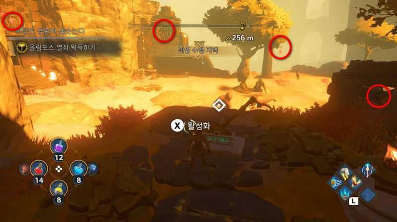 나침반의 목적지로 이동한 후, 위 사진의 빨간 동그라미로 표시된 위치에 있는 빨간 돌을 파괴하면 4개의 과녁이 보일 것입니다.