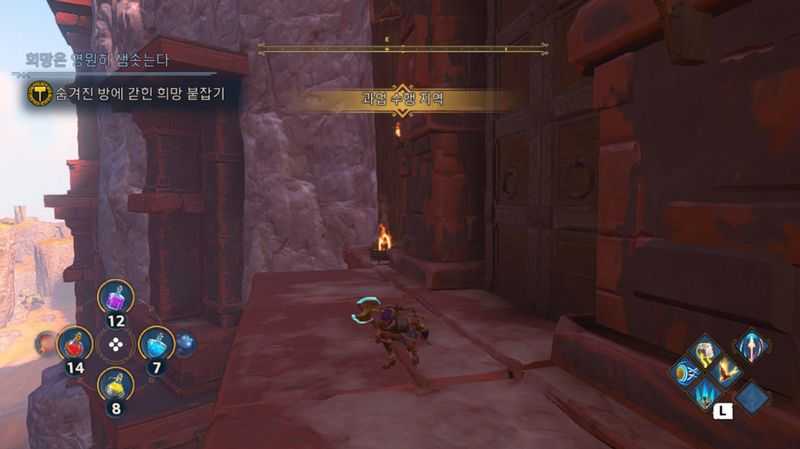 그후 위 사진에서 피닉스 옆에 보이는 레버를 활성화한 뒤, 일정시간 내에 신속하게, 4개의 과녁에 화살을 모두 맞추면, 레버 뒤에 있는 빨간 문이 열리게 됩니다.