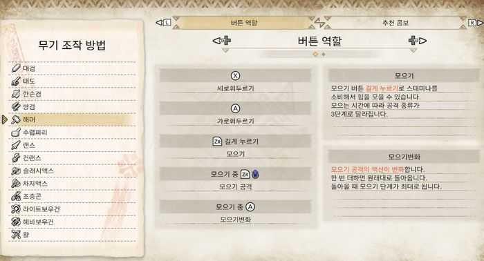 +를 눌러 메뉴를 띄운후, 헌터 노트에서 무기 조작 방법을 보면 기본적인 무기 조작법도 언제든 확인할 수 있습니다. 무기 조작을 연습할때는 마을의 수련장에서 연습하시면 좋습니다.