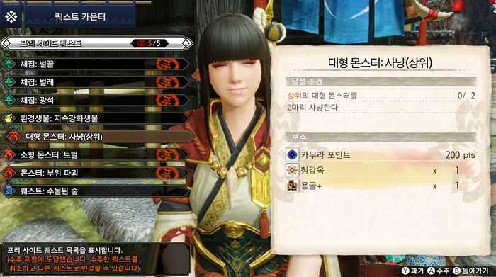 각종 아이템이나 카무라 포인트를 얻기에 유용하므로, 마을 퀘스트를 진행하기 전에 프리 사이드 퀘스트를 최대(5개)한 수주받고 진행하는 것이 좋습니다.