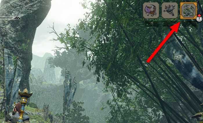 우측 상단을 보면 대형 몬스터 아이콘이 보일 것입니다. 아직 몬스터를 발견하기 전이라면 ? 라고 표시되며, 이때는 록온 을 할 수 없습니다.