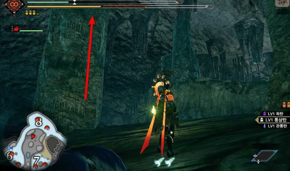 가루크 점프 + 벽 달리기 + 밧줄벌레 액션 x2 를 활용해 천장까지 도달할 수 있습니다. 밧줄벌레를 수집해 +1을 만들면 더욱 쉽습니다.