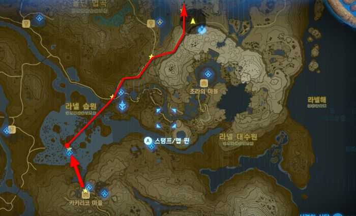 도중에 라넬의 탑 및 사오 코히의 사당 이 있습니다. 아직 방문한 적이 없다면, 라넬의 탑에 올라가 타워를 가동시켜 맵을 추가해두는 것도 좋습니다.