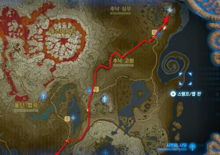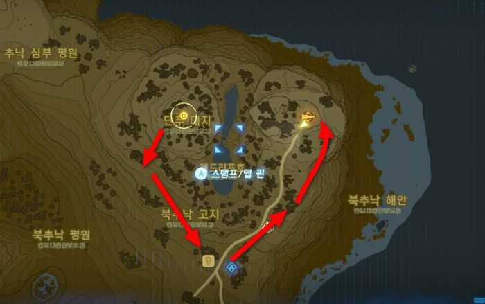 추낙의 탑에 올라가 타워를 가동시키고 맵을 추가해두면 좋습니다. 추낙의 탑에 오르다보면 젤리같은 물질로 뒤덮여 있는데, X버튼으로 점프하여 넘어가면 됩니다. 체력이 깎이므로 요리를 통해 회복해주면서 올라가면 됩니다.
