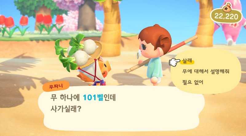 - 무파니에게서 구입한 무는 "근처에 두기"를 통해 섬 이곳저곳에 배치가 가능합니다. 하지만 구입한 무는 1주일이 지나면 썩어버립니다.