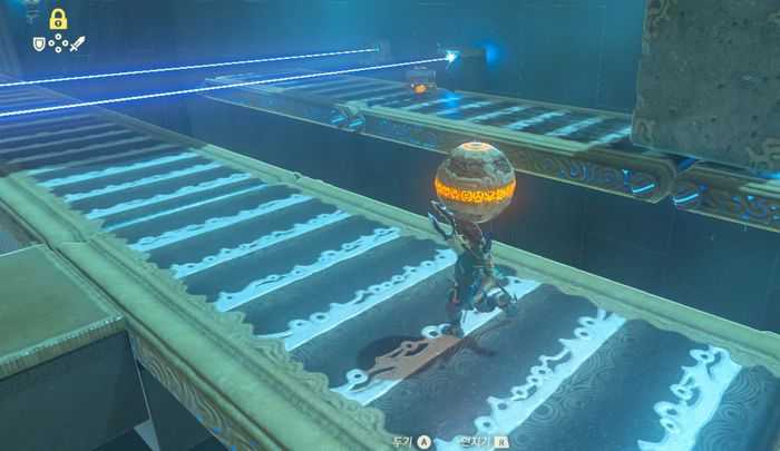 구슬을 타임 록으로 멈춘 뒤, 화살로 1회 타격하면, 구슬이 아래쪽 구멍에 들어가게 되고, 우측 문이 열립니다.