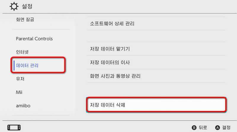 - 닌텐도 홈 화면에서 [설정]으로 들어간 뒤 [데이터 관리]를 선택합니다. 데이터 관리에서 [저장 데이터 삭제]를 선택합니다.