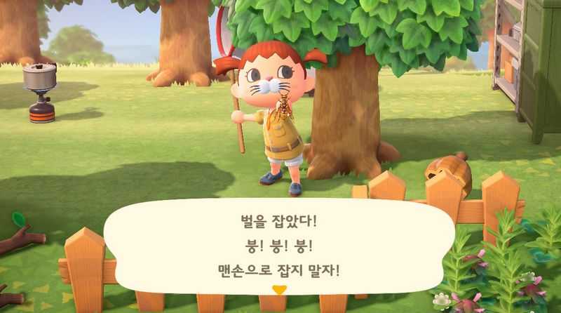 - 만약 잠자리채를 들고 있지 않은 상황이라면, 벌집이 떨어지자 마자 반대편으로 도망친 뒤, X버튼을 눌러 소지품 창을 엽니다. 소지품 창을 연 상태에서는 벌떼의 공격을 받지 않습니다. 소지품창에서 잠자리채를 선택하시고 벌이 달려드는 타이밍에 맞춰 바로 잡아주셔도 됩니다.