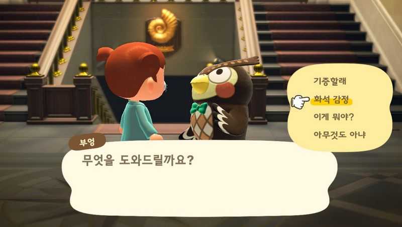 - 첫째로 화석을 발굴한 뒤, 박물관 관장인 부엉씨에게 감정 요청을 할 수 있습니다. 화석이 감정된 후 박물관에 화석을 기증할 수 있습니다.
