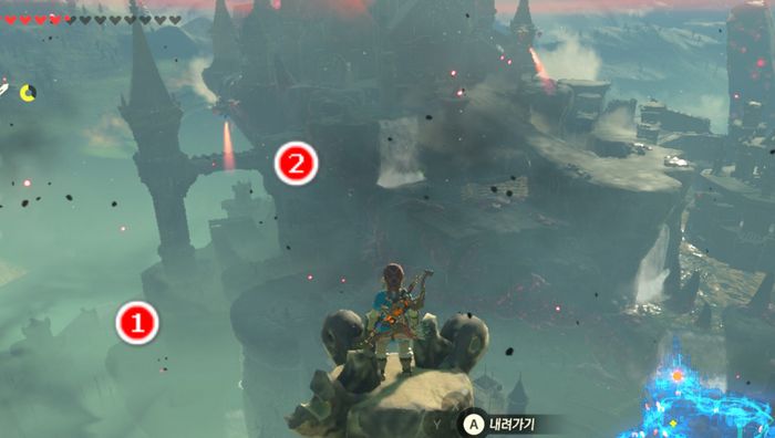 거대한 기둥의 꼭대기에서 이제 보스전을 치르기 위해, 아까전 사진의 2번 위치로 활강하게 됩니다.
